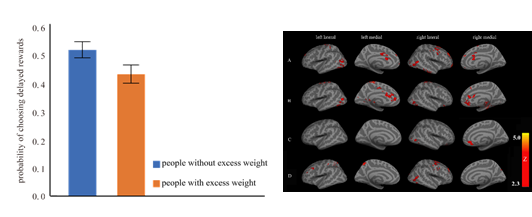 这些结果解释了超重和肥胖者冲动的行为特点,为超重和肥胖群体的延迟折扣能力缺陷增加了实证性的证据;从认知神经角度,深入探讨了超重和肥胖者在食物延迟折扣任务中大脑激活情况及与冲动性特质及食物成瘾之间的关系,有助于我们了解超重和肥胖者冲动性的心理及神经机制,并对在临床实践中干预超重肥胖者对食物的冲动,并增加在摄入食物期间的认知控制以及达到减少体重的目的有重要的科学价值。