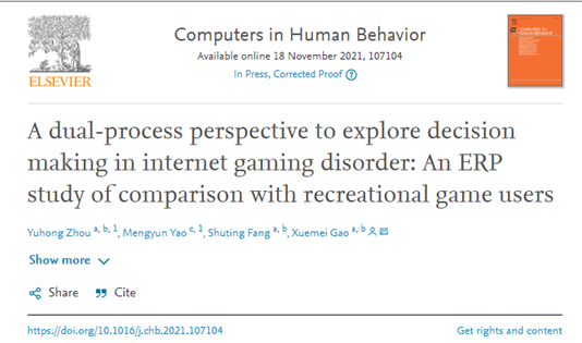 为了解决以上问题,高雪梅教授团队开展了系列研究工作。近期,该团队部分工作“A Dual Process Perspective to Explore Decision Making in Internet Gaming Disorder: An ERP Study of Comparison with Recreational Game Users”被JCR一区TOP期刊《Computers in Human Behavior》(SSCI一区,IF=6.829)正式接收(https://doi.org/10.1016/j.chb.2021.107104)。
