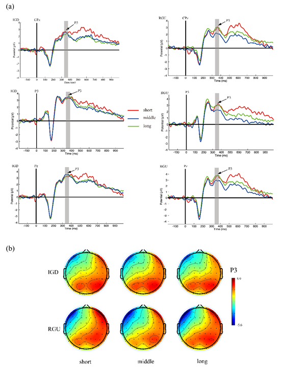 研究结果显示,在杯子任务中,娱乐型玩家(Recreational Game Users,RGU)在损失情境中的风险不利条件下会调用更多的认知控制资源避免损失,而IGD(Internet gaming disorder,IGD)玩家没有相关表现,提示IGD玩家表现出了较低的损失厌恶倾向(图1)。在延迟折扣任务上,RGU比IGD玩家表现出了更大的P2振幅,RGU在短期延迟和长期延迟中的P3振幅均大于中期延迟,而IGD玩家没有表现出任何与延迟时间相关的神经控制活动(图2),揭示IGD玩家在做出决策行为时可能缺乏深思熟虑的思考,现实奖赏对其吸引力降低。