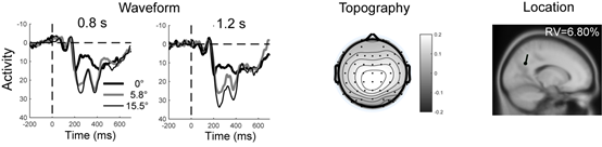 结果显示,实验参与者知觉到的时间长度随着两个小圆之间的时间间隔和空间距离的增加而增加(图2B),产生了典型的Kappa效应。此外,参与者知觉到时间越长,位于大脑顶叶区域的脑电成分P2和P3b的波幅就越大;偶极子源定位技术揭示顶叶P2和P3b成分发源于顶叶皮质(图3)。这些发现为时间与空间信息在工作记忆中整合成为共同的量值表征提供了电生理证据。