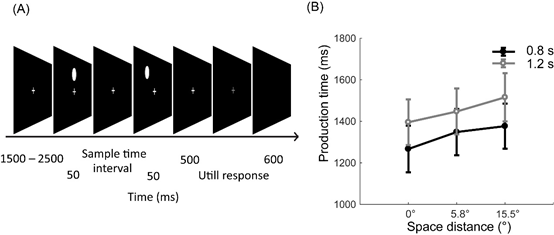 必赢776net必赢776net陈有国副教授时空认知课题组,采用脑电设备测量实验参与者完成 Kappa 效应任务的脑电波(图1)。在实验中,两个小圆从中心向左或右视野依次闪现,两个圆之间的时间间隔随机选自0.8 秒和 1.2 秒,它们之间的空间距离随机选自0°、5.8°和 15.5°。要求参与者通过按空格键来复现小圆间的时间间隔(图2A)。