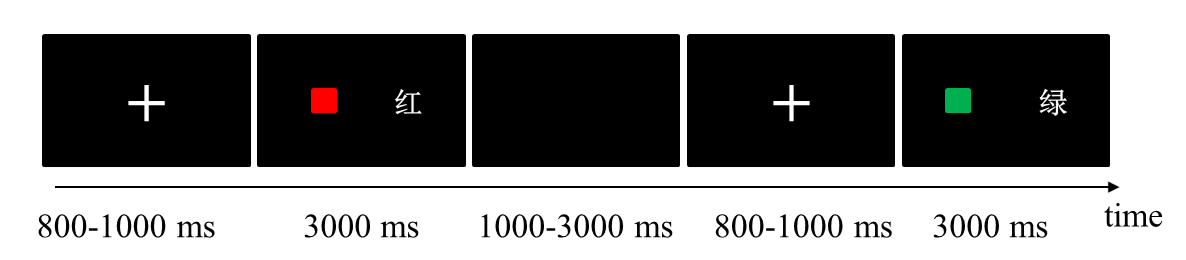 该研究主要探讨了微博过度使用与注意力分散的关系。子研究1采用问卷调查发现微博过度使用与日常生活中的注意力分散呈正相关。子研究2主要探讨微博过度使用者是否存在抑制干扰信息困难。虽然传统的Stroop任务能较好的评估个体抑制控制、注意力分散等问题,但目标刺激和干扰刺激往往重叠在一起(如用红色写的“绿”字)。因此,对基于反应时的传统Stroop任务的结果的解释也变得复杂,因为无法确认个体在反应时上的差异究竟是由于对目标刺激的加工困难导致,还是由于难以抑制干扰刺激导致。结合眼动追踪技术和改编的Stroop任务(将目标和干扰分离,放置在屏幕左右两侧,见图1)为这一问题提供了良好的解决方案。