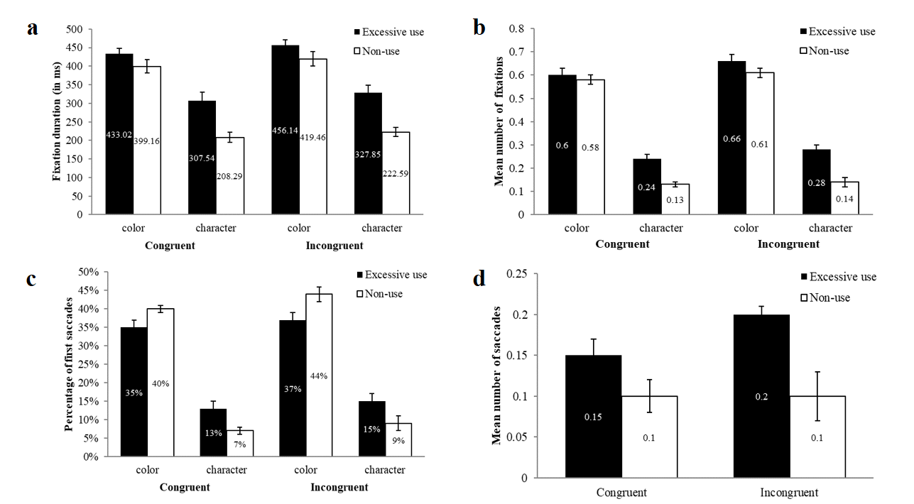 研究结果发现相比较于未使用微博者,过度使用微博者在改编后的Stroop任务中对分心刺激的注视时间更长、注视次数更多、首次眼跳向分心刺激的比例更大,在目标刺激和分心刺激上的眼跳次数更多,而在目标刺激上注视时间和注视次数并不存在显著差异(见图2)。这表明微博过度使用者在Stroop任务中较差的反应时成绩主要是由于难以抑制分心刺激的干扰所导致的。此外,该研究还使用工具变量回归-两阶段最小二乘法(IVR-2SLS)解决准实验法难以避免的内生性问题(双向因果,即注意分散的个体更容易被微博等快节奏、碎片化的社交媒体吸引,进而过度使用),尝试进行因果推断。研究结果支持了注意力分散假说,即长期浏览来自不同信息源的碎片化信息会导致在抑制无关信息上更加困难。该研究从首次从信息参与的视角为理解媒体过度使用与注意力分散的关系提供了理论解释和实证支持,对数字干扰背景下的注意力分散的干预和预防具有重要意义。