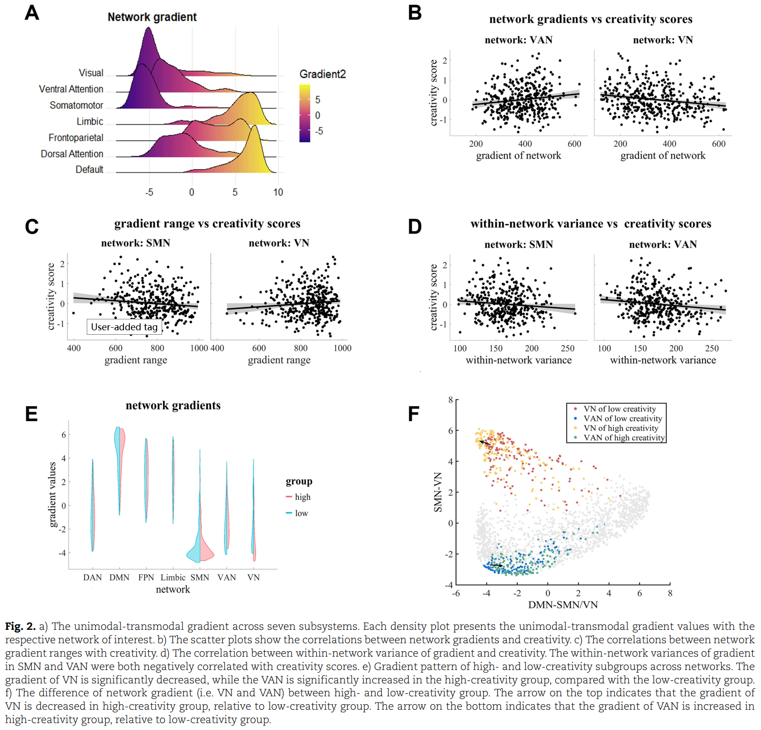 大脑的功能连接梯度的发现为解释高级认知能力提供了新的框架。本研究基于大样本脑影像数据库(Southwest University Longitudinal Imaging Multimodal,SLIM dataset),利用静息态功能连接梯度的方法发现,个体创造性与初级皮层(visual network)和联合皮层(DMN,FPN等)之间在梯度上的距离呈正相关关系。该结果表明,负责复杂抽象认知功能的联合皮层与负责环境信息输入的低级脑区之间的功能分化越明显,前者越不易受到后者的干扰,从而实现较好的创造性表现;相反,若高级脑区较易受到低级脑区的信息干扰,则创造性表现较差。另外,该结果在本研究团队的另一大样本脑影像数据库(GBB dataset)上得到了良好验证。该结果同时也验证了神经科学领域的“束缚假说” (“Tethering hypotheses”),即,联合皮层通过增加其与负责外界信息输入的初级皮层之间的分离而获得其信息整合和抽象化的功能属性。