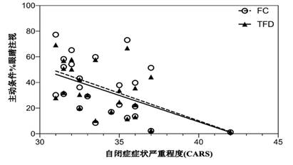 图2. 自闭症症状的严重程度 (CARS)与主动任务中眼部区域注视TFD/FC占比之间的相关分析散点图 [(rTFD = - 0.500;rFC = - 0.497, p < 0.05)