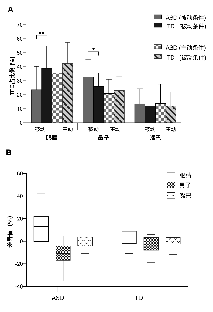 图1. (A) ASD组和对照组对眼睛的总注视时长 (TFD) 占比在被动观察面孔时差异显著 t (1, 48) = -3.316, p = 0.002, Cohen’s d = 0.936),而在主动观察面孔时间,对眼睛的注视显著增强,达到和对照组相似水平,(t (1, 48) = -1.272, p = 0.209, Cohen’s d = 0.357); (B) 不同任务下对眼口鼻TFD的差异