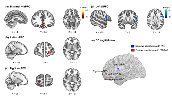 首先,该成果利用交叉滞后模型分析验证了双价评价恐惧理论,结果发现负面评价恐惧和正面评价恐惧均可以预测社交焦虑症状的发展;第二,利用静息态核磁指标(分数低频振幅)探索了评价恐惧和社交焦虑的神经基础,结果发现左侧背外侧前额叶表征了负面评价恐惧、腹内侧前额叶表征正面评价恐惧和社交焦虑(图二)。
