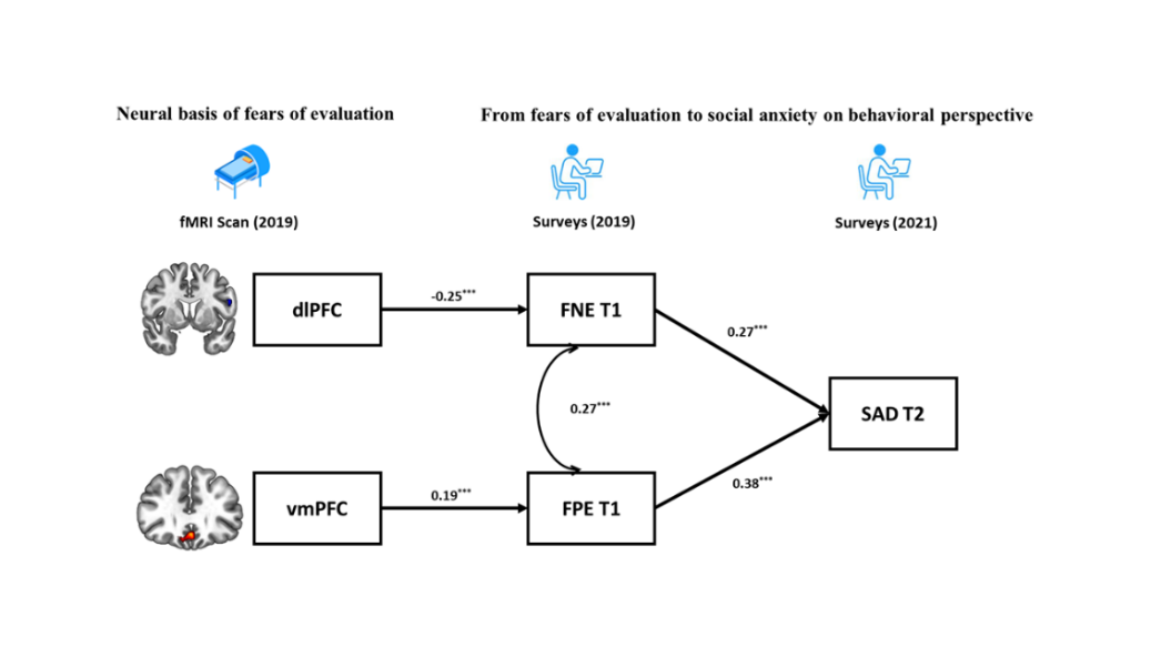 近日,必赢776net必赢776net何清华教授团队与澳大利亚国立大学Junwen Chen博士和墨尔本大学Ofir Turel教授团队合作,根据这一现象和理论,在《International Journal of Clinical and Health Psychology》(SSCI收录,中科院心理学大类1区,临床心理学小类1区Top期刊,IF=5.9)发表论文,题为“From fears of evaluation to social anxiety: The longitudinal relationships and neural basis in healthy young adults”。该文利用纵向的行为数据和静息态大脑指标,揭示了从不同效价(正面/负面)评价恐惧到社交焦虑症状的发展过程,并探索了大脑前额叶皮层对不同效价评价恐惧的表征(图一)。