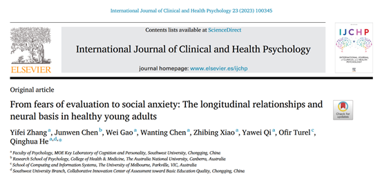 Zhang, Y., Chen, J., Gao, W., Chen, W., Xiao, Z., Qi, Y., Turel, O., He, Q.* (2023). From fears of evaluation to social anxiety: The longitudinal relationships and neural basis in healthy young adults. International Journal of Clinical and Health Psychology, 23: 100345. DOI: 10.1016/j.ijchp.2022.100345.