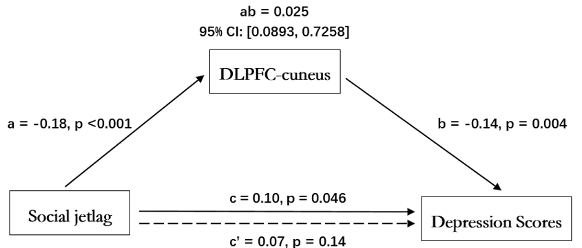 在验证MCTQ有效性的基础上,雷旭教授团队使用该问卷计算得出的社会时差变量,对社会时差与抑郁情绪间相关关系的神经机制进行了探究。结果发现,社会时差与抑郁得分存在显著的正相关关系,并且静息状态下的功能磁共振信号,表现出背侧前额叶-楔叶的连接能够中介社会时差与抑郁两者之间的相关关系。研究揭示了社会时差导致个体抑郁程度增强的神经机制。具体来讲,社会时差会对一个人的认知功能产生持久的影响,主要是自上而下的注意力控制缺陷,从而使高社会时差个体难以控制对不愉快信息的注意力偏好,导致更多抑郁主观症状的出现。