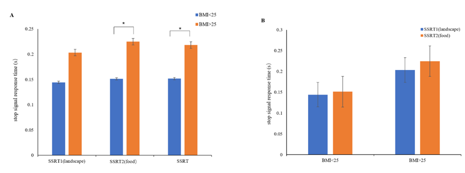 行为结果表明,与BMI健康的个体相比,BMI较高的个体在对食物特异的停止信号反应时(SSRT)表现出明显延迟,即更难以抑制对食物的反应,而在对中性刺激的抑制控制方面没有显著差异。进一步比较BMI较高的个体对食物和中性刺激的抑制控制时,发现两种刺激之间的SSRT没有显著差异。因此,较高的BMI和受损的抑制控制之间的关系不仅特定于与食物背景,更可能是一个普遍的问题。