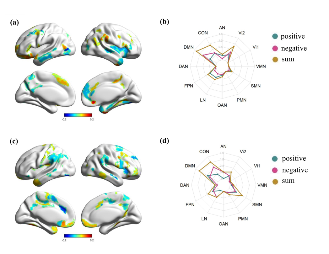 图2. LR与创造性思维维度间的相关模式 (a, b) 言语创造性思维的脑区及脑网络分布 (c, d) 视空创造性思维的脑区及脑网络分布