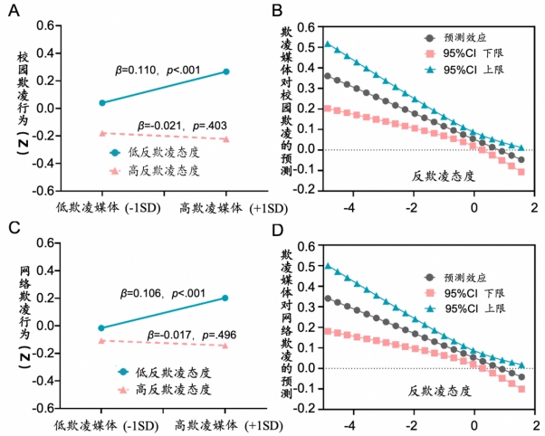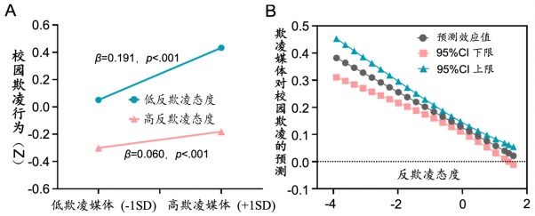 研究1通过对10391名青少年的横断调查,考察了欺凌报道与欺凌态度对校园欺凌的预测。结果表明,欺凌报道与校园欺凌行为存在显著正相关。同时,欺凌支持态度高的个体会放大这种关联,即青少年对欺凌的支持态度越高,媒体欺凌报道对校园欺凌行为的预测作用就越大(图1所示)。研究2通过对3125名青少年的调查,重复了研究1的结果,并将结论进一步拓展至网络欺凌。研究发现了一致的效应,即青少年对欺凌的支持态度越高,媒体欺凌报道与欺凌行为(校园欺凌和网络欺凌)的关联更大(图2所示)。研究3通过对2744名青少年为期半年的追踪调查,结果也发现了媒体欺凌报道正向预测欺凌行为(校园欺凌和网络欺凌),但效应量较小。总之,该研究采用三个青少年大样本,揭示了媒体欺凌报道与青少年欺凌行为的关联,特别是对于某些群体(如对欺凌的支持态度较高的青少年)关联更大。虽然效应量较小,但这项研究提供了欺凌媒体报道与青少年现实欺凌行为关联的初步证据。这对新媒体时代,如何科学利用媒体传播来防治欺凌行为,以及宣传反欺凌视频具有重要参考价值。