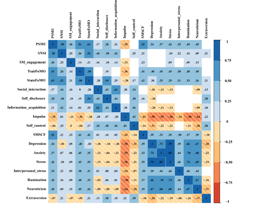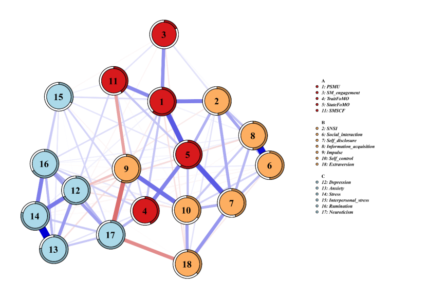 《Information, Communication & Society》上发表论文“A network analysis approach to core symptoms and symptom relationships of problematic social media use among young adults”,该研究基于I-PACE模型、以变量为中心使用网络分析的方法探索了PSMU与社交媒体使用行为、心理风险因素(人格特质、负面情绪和认知、自我控制)之间的关系。结果发现:状态错失恐惧与PSMU关系最为密切,其次是社交媒体使用强度、社交媒体自我控制失败与社交媒体参与度,而人格变量神经质是影响整个网络模型的重要远端因素。其中,错失恐惧、社交媒体参与度和社交媒体自我控制失败是PSMU的核心表征。研究发现有助于对PSMU的发展过程进行概念化和可视化的解释,具有重要的理论和实践意义。