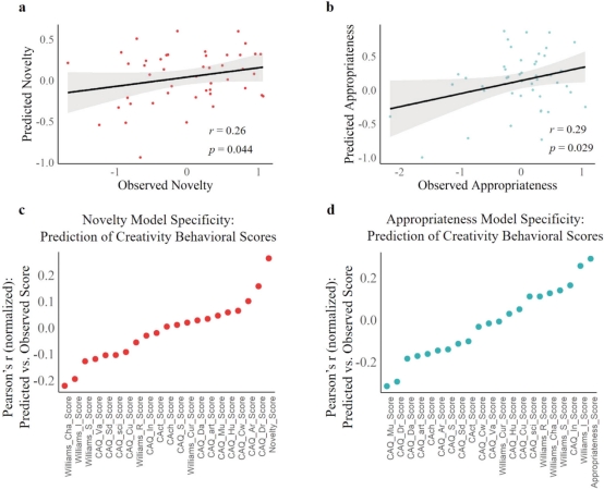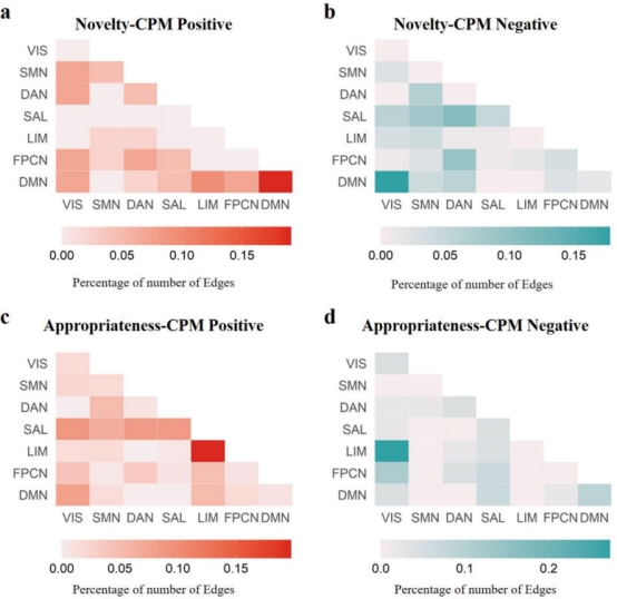 (2) 接下来,在静息态fMRI 数据中,研究采用连接组预测建模的方法(Connectome Predictive Modeling, CPM),定义了两个基于功能网络的模型——主要由默认网络内的相互作用和边缘网络内的相互作用主导——分别预测新颖性和适宜性(图3)。