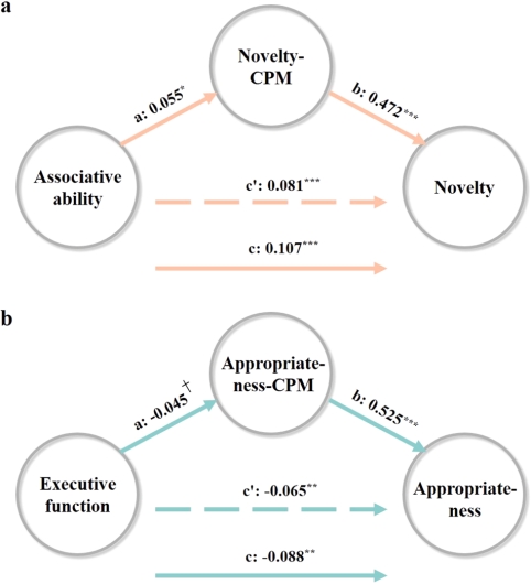(4) 最后,这两种功能连接模式分别中介了语义联想/执行控制与新颖性/适宜性之间的关系(图6)。