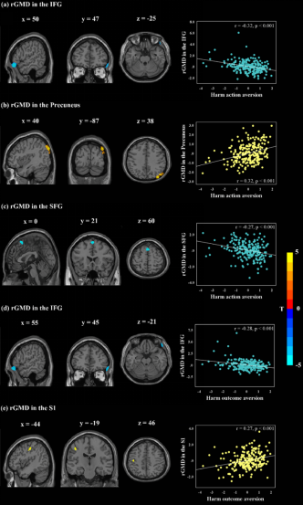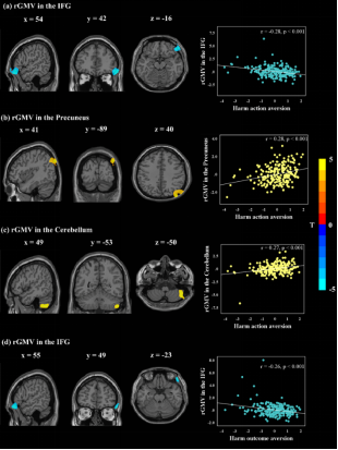 该研究采用基于体素形态学分析(voxel-based morphometry, VBM)来探究大脑灰质体积、密度与伤害行为/结果厌恶的关系。基于全脑的多元回归分析结果显示,伤害行为厌恶与额下回的灰质体积/密度和额上回的灰质密度负相关,与楔前叶的灰质体积/密度和小脑的灰质体积正相关(图1和图2);伤害结果厌恶与额下回的灰质体积/密度负相关,与初级体感皮层的灰质密度正相关(图1和图2)。进一步的预测分析提示,上述结果具有稳健性。
