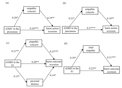 在此基础上的中介效应分析显示,共情关注在楔前叶的灰质体积/密度和伤害行为厌恶的关系间起中介作用(图3a和图3b)。共情关注和个人痛苦在初级体感皮层的灰质密度与伤害结果厌恶的关系间起中介作用(图3c)。此外,共情在初级体感皮层的灰质密度与伤害结果厌恶的关系间起中介作用(图3d)。