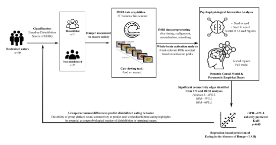 研究纳入了60名女性限制性进食者,根据其去抑制得分划分为去抑制组与非去抑制组。所有被试均在饱腹状态下完成两项任务:一项是用于采集脑成像数据的线索浏览任务(食物线索 vs. 中性线索),通过视觉呈现高热量食物图片激发外部奖赏线索;另一项是非饥饿状态下的实际进食行为测验(EAH),用于评估去抑制进食行为的现实表现。