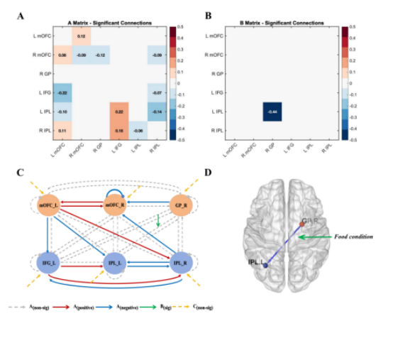 论文信息:Wang, S., Xiao, M., Han, J., Cui, Y., & Chen, H. (2025). Dysregulated reward-inhibition network interactions during food-cue exposure in disinhibited restrained eaters: Evidence from task-based PPI and DCM. International Journal of Eating Disorders, 1–14.