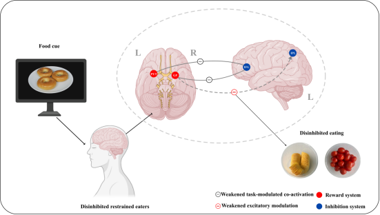 在“追求理想身材”成为社会热议焦点的当下,限制性进食(Restrained Eating)正成为不少女性尝试控制体重的常见方式。然而,部分人群在面对诱人食物时常常“破防”——出现去抑制行为(Disinhibition),这一行为被认为是从限制性进食发展成为饮食失调(尤其是暴食)的重要前兆。尽管已有研究关注大脑奖赏系统或抑制系统的单独作用,但去抑制行为背后的跨网络神经交互机制仍缺乏系统阐释。