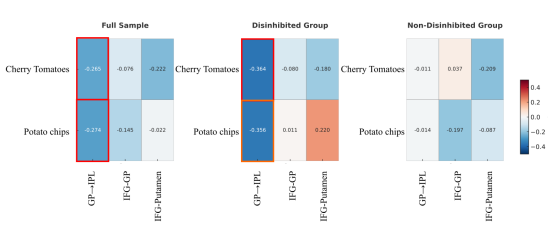 图4. 基于PPI及DCM的神经连接对实际去抑制进食行为的预测作用。图中数值为标准化回归系数(standardized β),红色边框表示显著效应(p < 0.05);橙色边框表示边缘显著效应(p = 0.05)。