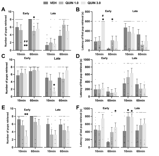 · 在VTA中,D2受体激活显著破坏了产后早期母鼠的幼崽衔回行为(图1A和1B),但对产后晚期影响有限。