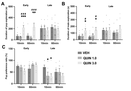 · 在mPFC中,D2受体激活在早期和晚期均可干扰母性行为(图1 E和1F),并在早期阶段增加母鼠对幼崽与成年雄鼠的探索倾向(图2A和2B)。