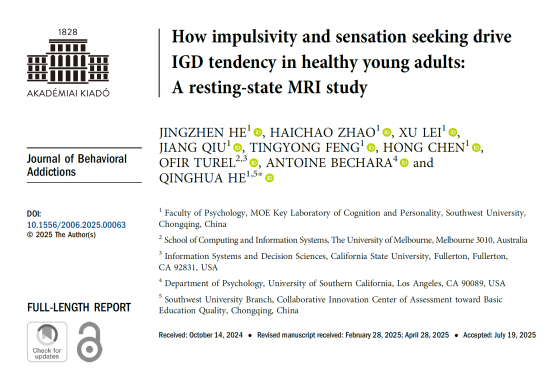 2. He, J., Zhao, H., Lei, X., Qiu, J., Feng, T., Chen, H., Turel, O., Bechara, A., He, Q.*(2025). How Impulsivity and Sensation Seeking Drive IGD Tendency in Healthy Young Adults: a Resting-State MRI Study. Journal of Behavioral Addictions.