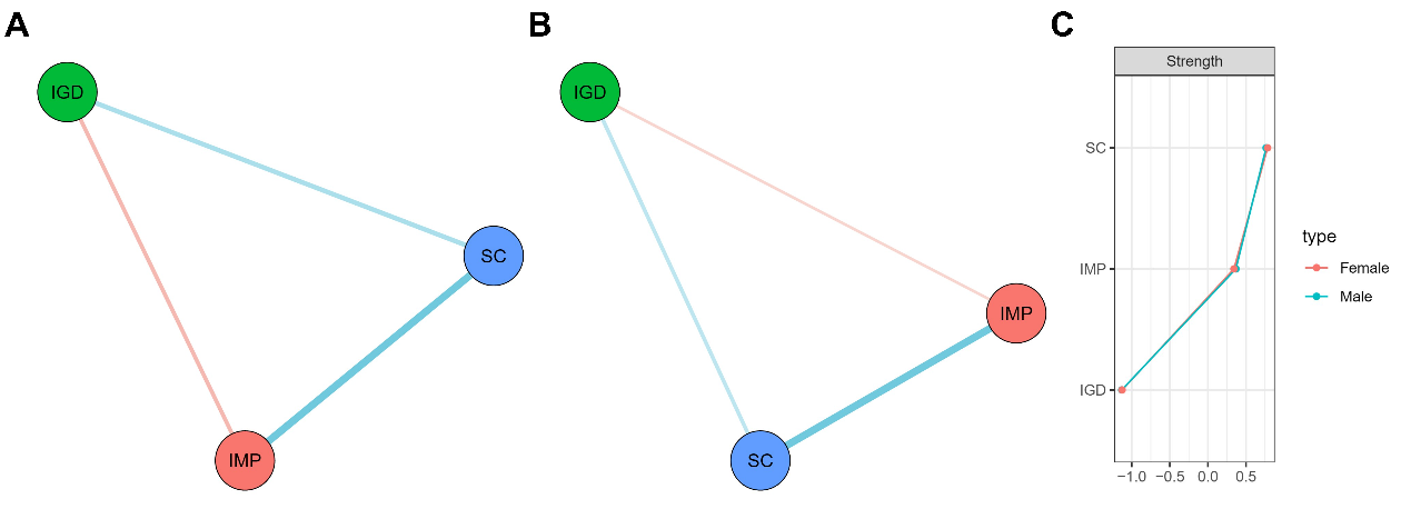 近日,必赢776net必赢776net何清华教授团队在《Computers in human behavior reports》(影响因子5.8)上发表了题为“Sex-based Differences in the Impacts of Impulsivity and Self-Control on Internet Gaming Disorder Tendencies”的文章(图1)。该研究测量了1222名大学生(405名男性,817名女性)的IGD倾向、IMP和SC,采用网络分析的方法发现:在基于总分的三节点网络的分析中,男女网络中自我控制均具有最高的节点强度,男性IGD网络的强度大于女性,并且男性的IGD倾向和IMP-IGD联系强于女性(图2);在基于IGD症状网络的分析中,男女网络中网络游戏影响学习的症状具有最高的节点强度,男女网络结构存在差异,具体表现为男性的IMP与IGD的联系更紧密(图3)。