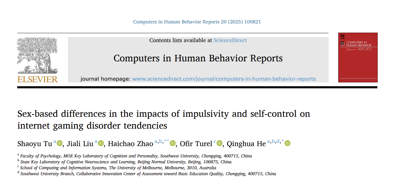 Tu, S., Liu, J., Zhao, H.*, Turel, O., He, Q.* (2025). Sex-based Differences in the Impacts of Impulsivity and Self-Control on Internet Gaming Disorder Tendencies. Computers in Human Behavior Reports, 20: 100821.