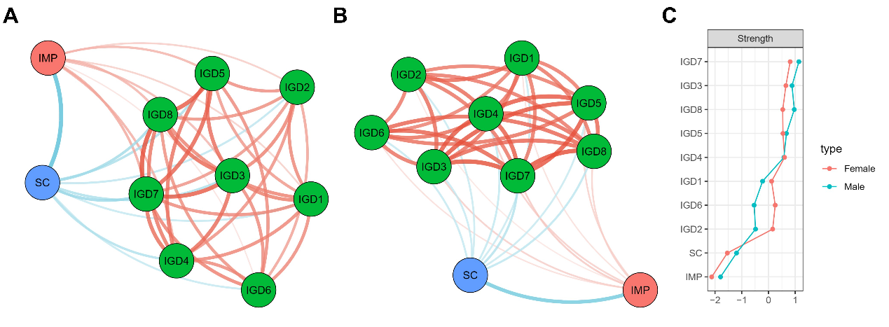 图3:基于症状的IGD、SC、IMP网络:(A)男性,(B)女性