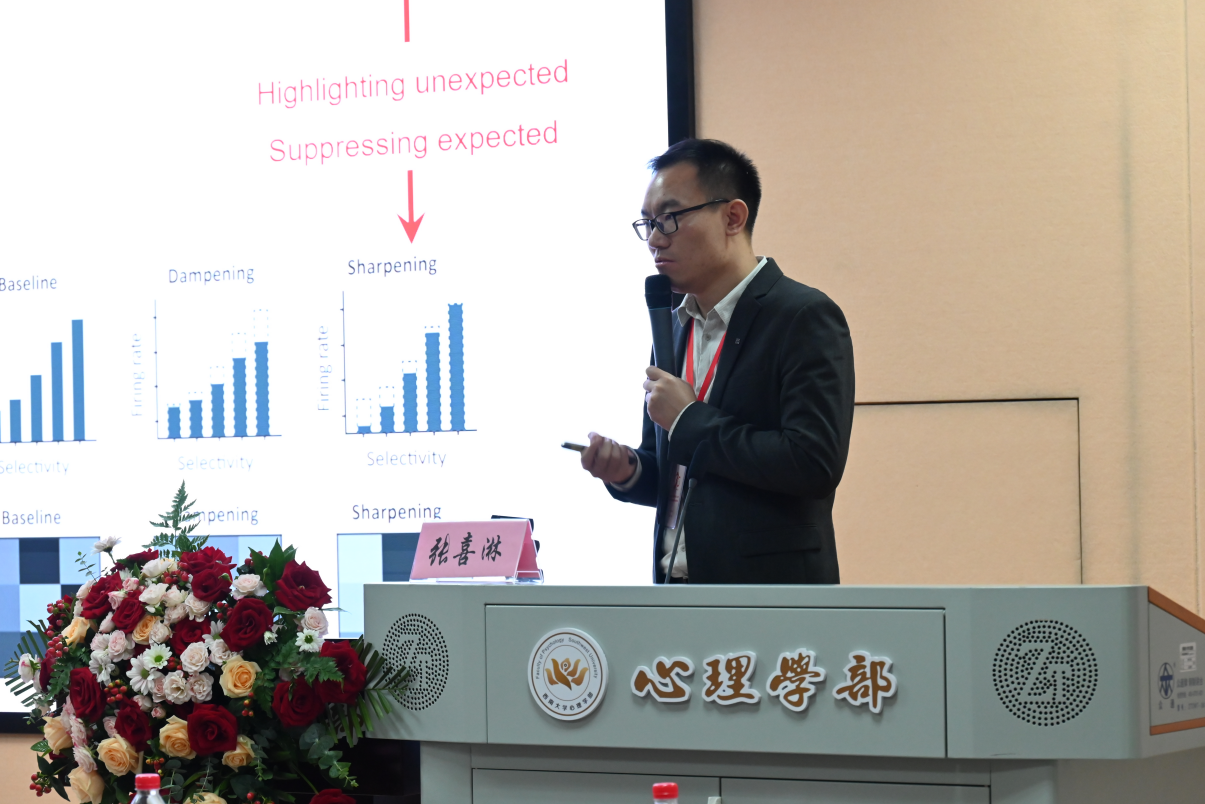 学部401会场,由必赢776net必赢776net教授高笑主持聚焦于神经影像、应激与疼痛等领域。中国科学院心理研究所研究员胡理介绍了“Neuroimaging-based pain biomarkers”的研究进展,为疼痛管理提供了新的思路。必赢776net必赢776net教授高军探讨了“应激影响母性行为与健康的神经机制”,揭示了应激对母性行为及健康的深远影响。必赢776net必赢776net教授韩鹏飞分享了“Valence and context-dependent alteration of odor perception after acute stress”的研究成果,展示了应激对嗅觉感知的复杂影响。后半场由四川师范大学脑与心理科学研究院教授刘强主持,中国科学院心理研究所研究员周雯报告了Human olfactory perception embeds fine temporal resolution within a single sniff的研究成果。浙江大学心理与行为科学系教授周吉帆、北京师范大学认知神经科学与学习国家重点实验室教授薛贵分别探讨了“客体关系工作记忆”和“序列记忆的神经机制与调控”的相关话题。